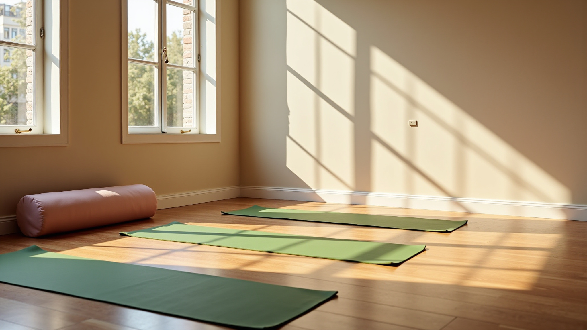 Wir sind in einem wunderschönen ruhigen & großen Yogaraum mit Terrasse